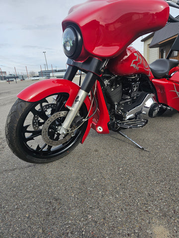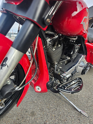 Custom built Harley chin spoiler which will fit all touring models 00-2023, with or without crash bars or pods. This is for non raked bike, but will fit raked. On non raked bikes will fit up to a 23" front wheel.