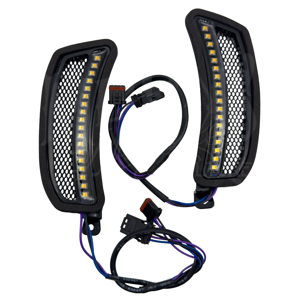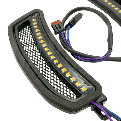 Enhance your Softail Low Rider ST (FXLRST) fairing vent LED lights with our single-row dual-color LED light kit featuring decorative black mesh inserts. Each unit contains 18 high-quality LED chips that create a bright white DRL around the border, along with a sharp, high-contrast amber turn signal. The kit includes a plug-and-play wire harness for effortless installation under the front fairing. You have the option to use these with your existing turn signals or remove them to run solely with the vent lights for a sleek, custom look.